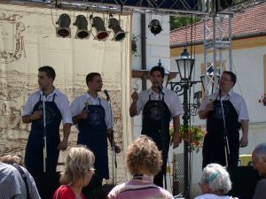 當然,這還包含了試喝三種酒啦。台上有四個大男人,身穿工作服加藍色的圍群,手上拿著酒杯,唱的可能是當地的